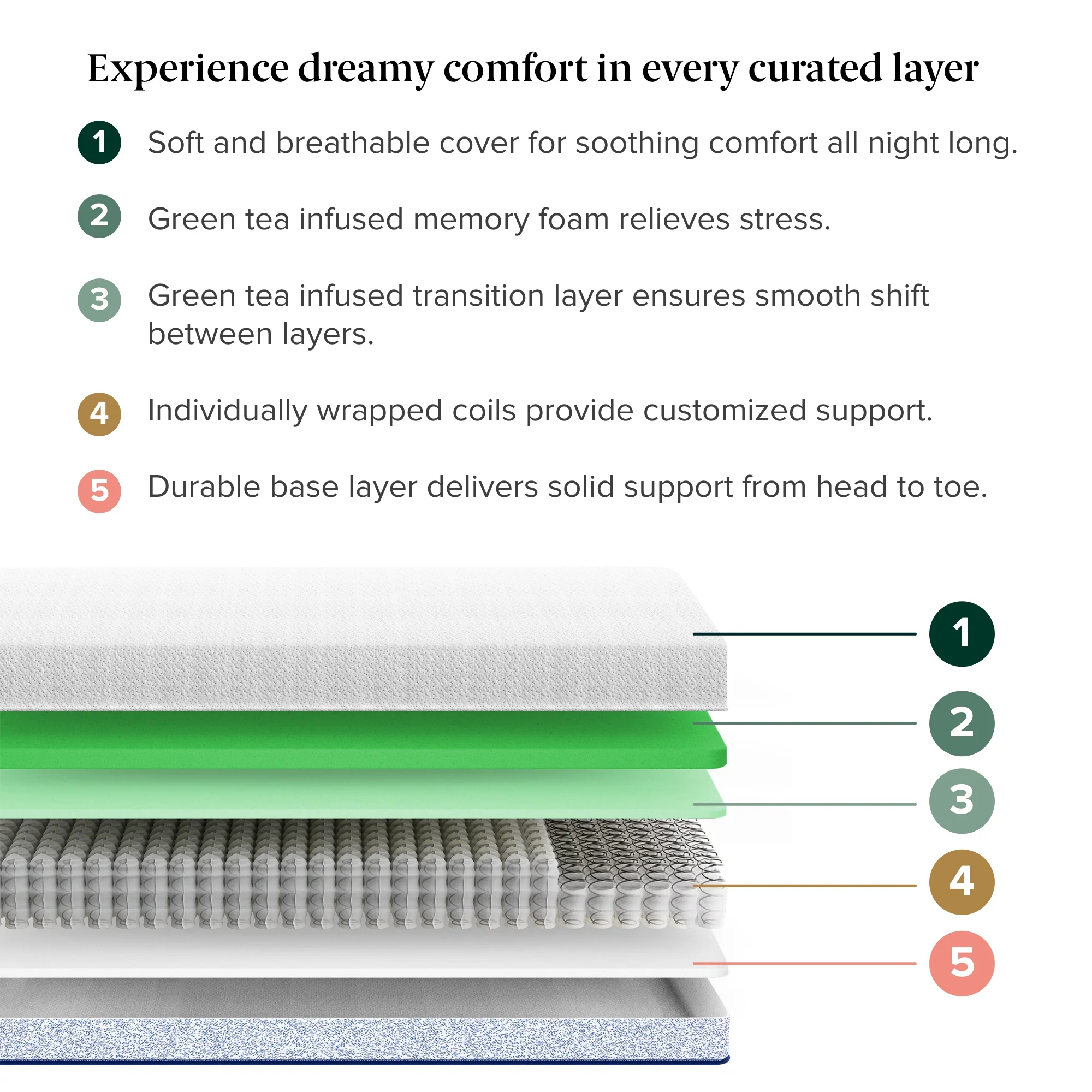 Don't just dream about great sleep, experience it! This hybrid mattress offers all the pressure relieving and refreshing benefits of our Original Green Tea memory foam mattress, plus customized support & reduced partner disturbance from individually wrapped coils.